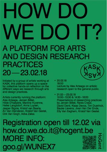 Dear student, researcher, teacher at KASKIt is our great pleasure to invite you to participate in the event How Do We Do It? on 20-23 February 2018 in KASK, Ghent.On this platform for research practices in art and design, we aim to focus on the fundamental and pragmatic sides of artistic research, simply by discussing the variety of ways of how we do it.Below you can read the details of our three-day program. For a full attendance to the complete program you need to register, by sending an email-message to how.do.we.do.it@hogent.be, before February 12.The opening lecture by Alex Arteaga on Tuesday 20 February at 18:00 in ZWARTE ZAAL is freely open to the all. We'd appreciate a short note if you plan to attend, by email to how.do.we.do.it@hogent.be.You are very welcome,the How Do We Do It?-organising committee:Alex Arteaga, Chokri Ben Chikha, Jeroen Billiet, Hilde D’haeyere, Martine Huvenne, Heike Langsdorf, Anna Luyten, Jasper Rigole, Kristof van Baarle, An van. Dienderen, Kristof Van Gestel, Dirk Van Gogh, Adva Zakai.-------------------------------------------------------------------------------------------------------How Do We Do It? - A platform for arts and design research practices